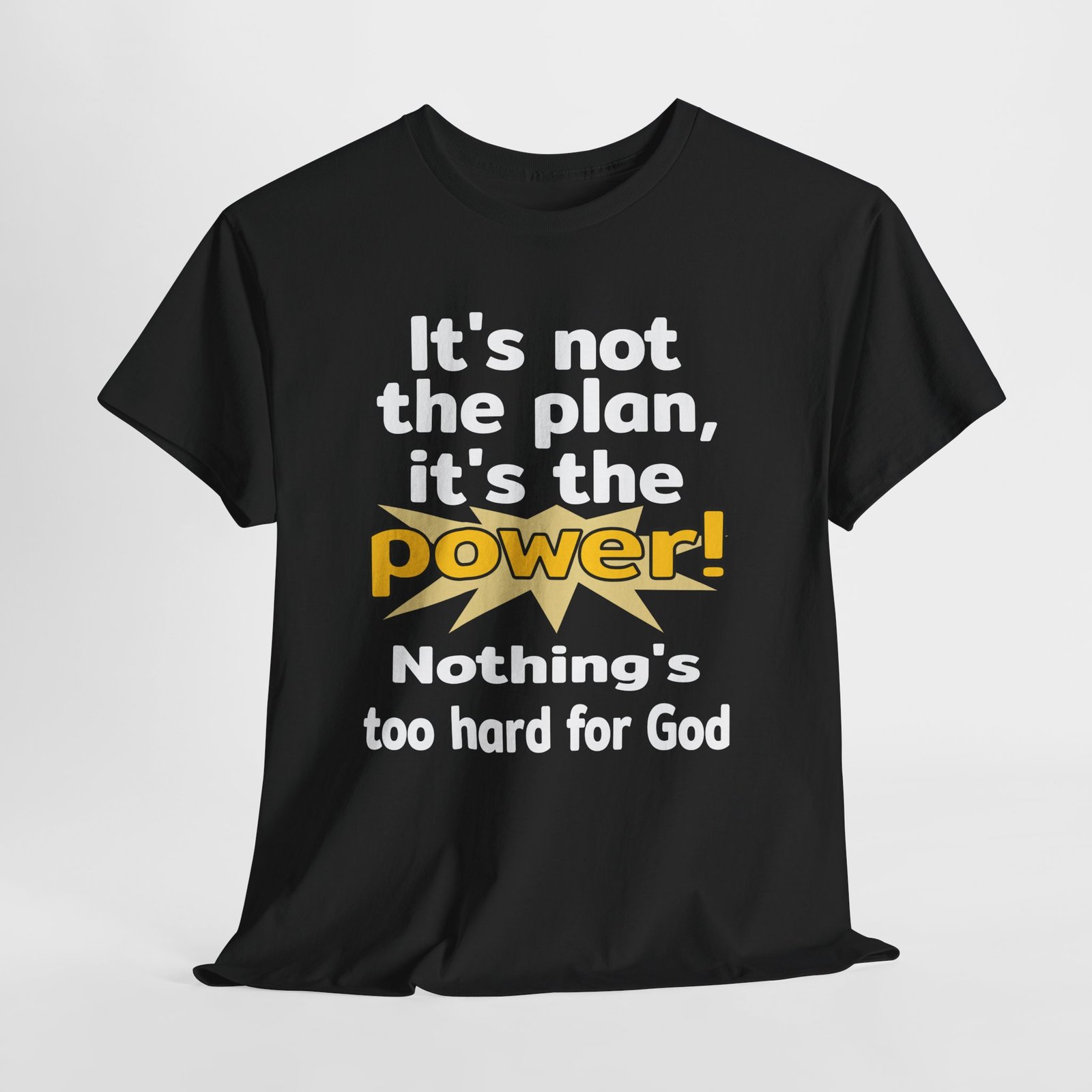 The image displays a motivational text message featuring a bold typographic design. The phrase “It’s not the plan, it’s the power!” is prominently displayed, with “power” highlighted in a stylized burst or starburst graphic element. Below the main text, an additional line reads “Nothing’s too hard for God”, emphasizing a message of spiritual empowerment and possibility. The text is arranged vertically, creating a dynamic and impactful visual composition. The graphic uses a striking, high-contrast style with large, attention-grabbing lettering that conveys a sense of inspiration and encouragement.