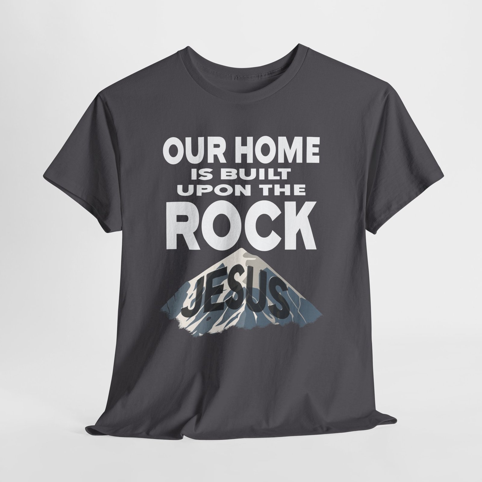 This graphic design poster features a bold typographic message stating “OUR HOME IS BUILT UPON THE ROCK” with the word “JESUS” stylized as a mountain or rock formation beneath the text. The typography is large, clear, and impactful, using a stark white font that stands out prominently against the background. The word “JESUS” is integrated into the imagery of a rocky mountain peak, suggesting a metaphorical foundation or cornerstone. The design uses a minimalist, graphic approach with sharp edges and a layered visual hierarchy. The image appears to be a religious or faith-based motivational poster emphasizing spiritual strength and foundation.