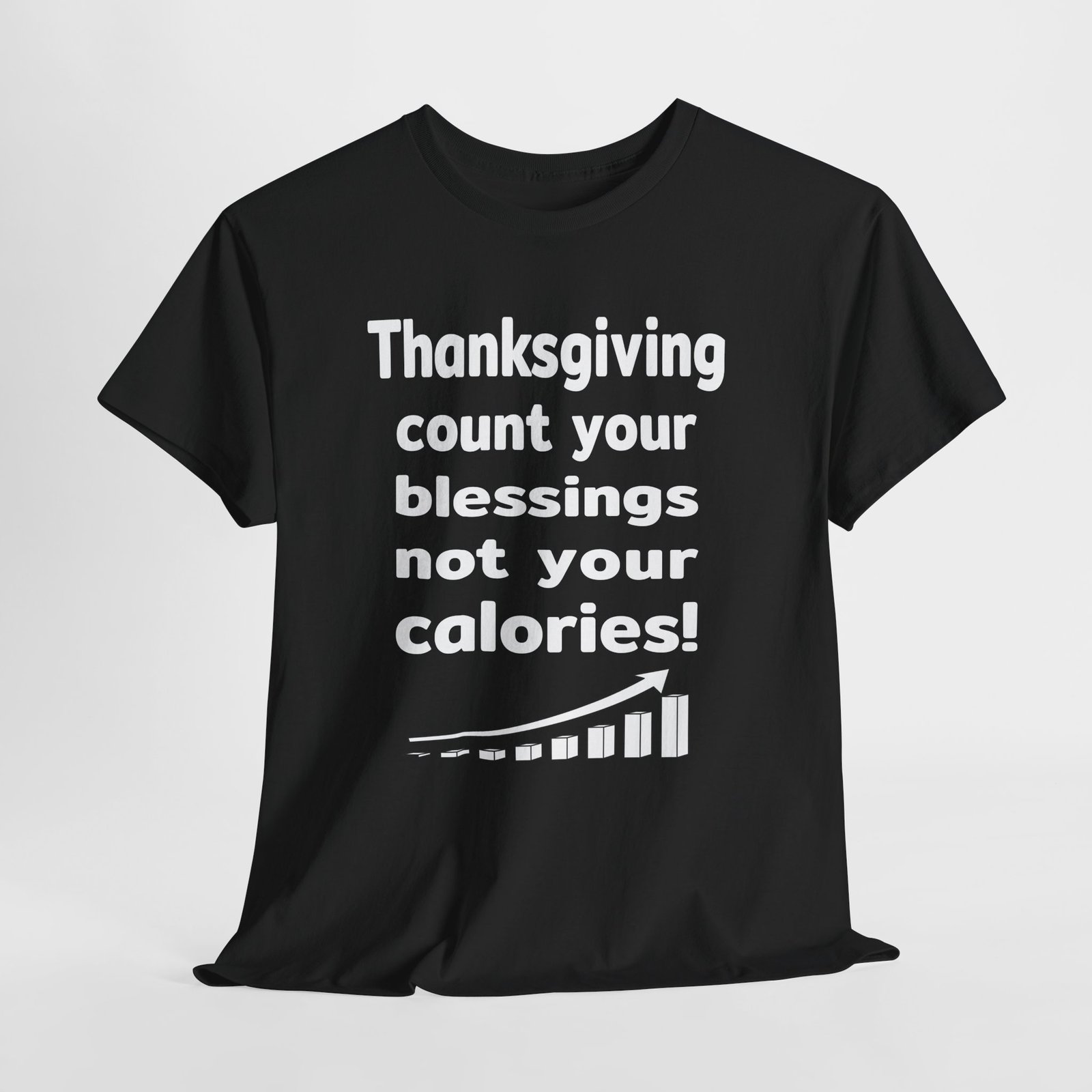 This motivational image features a bold, impactful message about Thanksgiving, encouraging viewers to focus on gratitude and mindful eating. The text reads “Thanksgiving: count your blessings not your calories!” displayed in a large, striking font that emphasizes the message. Accompanying the text is a graphic showing an upward-trending bar graph with an ascending arrow, symbolizing growth, positivity, and improvement. The design uses a minimalist approach with stark contrasts to draw attention to the inspirational quote. The graph’s progression visually reinforces the message of shifting perspective from calorie counting to appreciating life’s blessings.